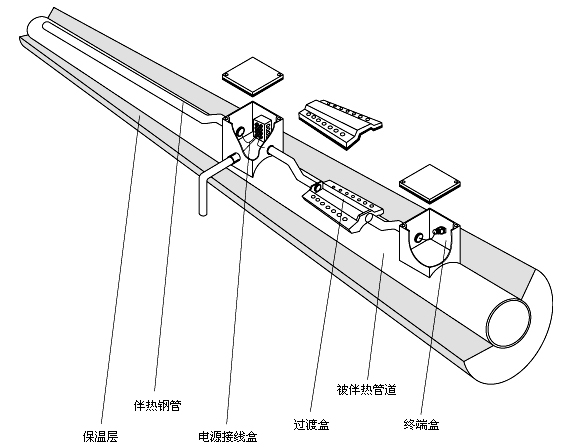 管道集膚效應伴熱技術裝置,基本上由變壓器、加熱電源、輸液管、伴熱管和集膚電纜、保溫層、保護外殼等部分組成。加熱電源分工頻和中頻加熱電源兩種;輸液管和伴熱管為普通鋼管,伴熱管直徑為15-40mm,間斷的焊接在輸液管上;伴熱電纜穿在伴熱管中,外面是保溫層和保護外殼。